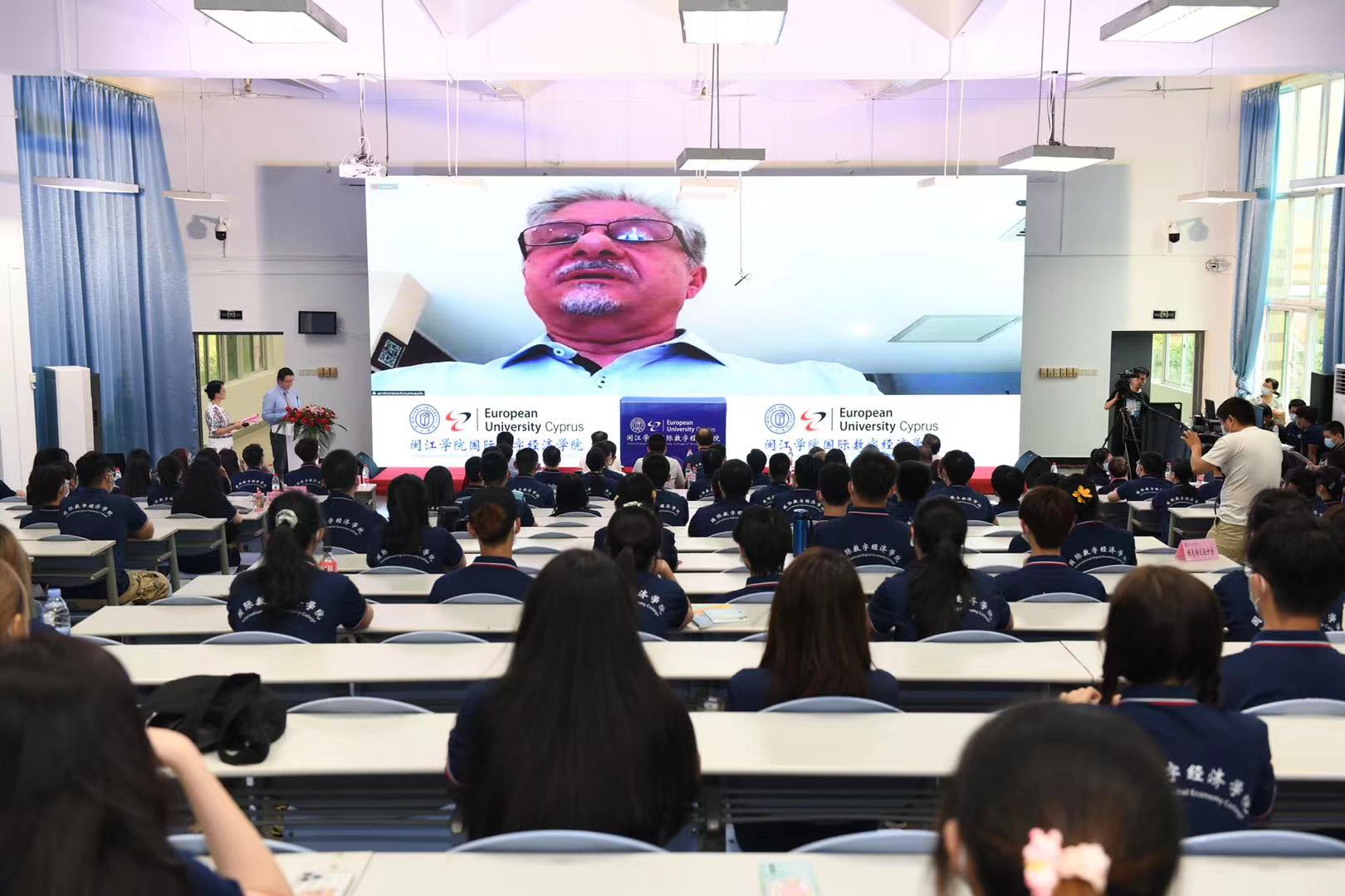On September 12, 2021, the opening ceremony of the International Digital Economy College was successfully held in Minjiang University. The Cyprus Ambassador to China, H.E. Antonis Toumazis, and the Chinese Ambassador to Cyprus, H.E. Liu Yantao attended the opening ceremony via Internet and delivered speech. Besides, the principals of Minjiang University and European University Cpyrus, the related program leaders and colleges directors, as well as the faculty and freshmen representatives of the International Digital Economy College attended the ceremony. Mr. Liu Jiting, special advisor to the president of the European University Cyprus, attended and co-chaired the ceremony with Lin Zhongyan, Dean of the International Digital Economy College.