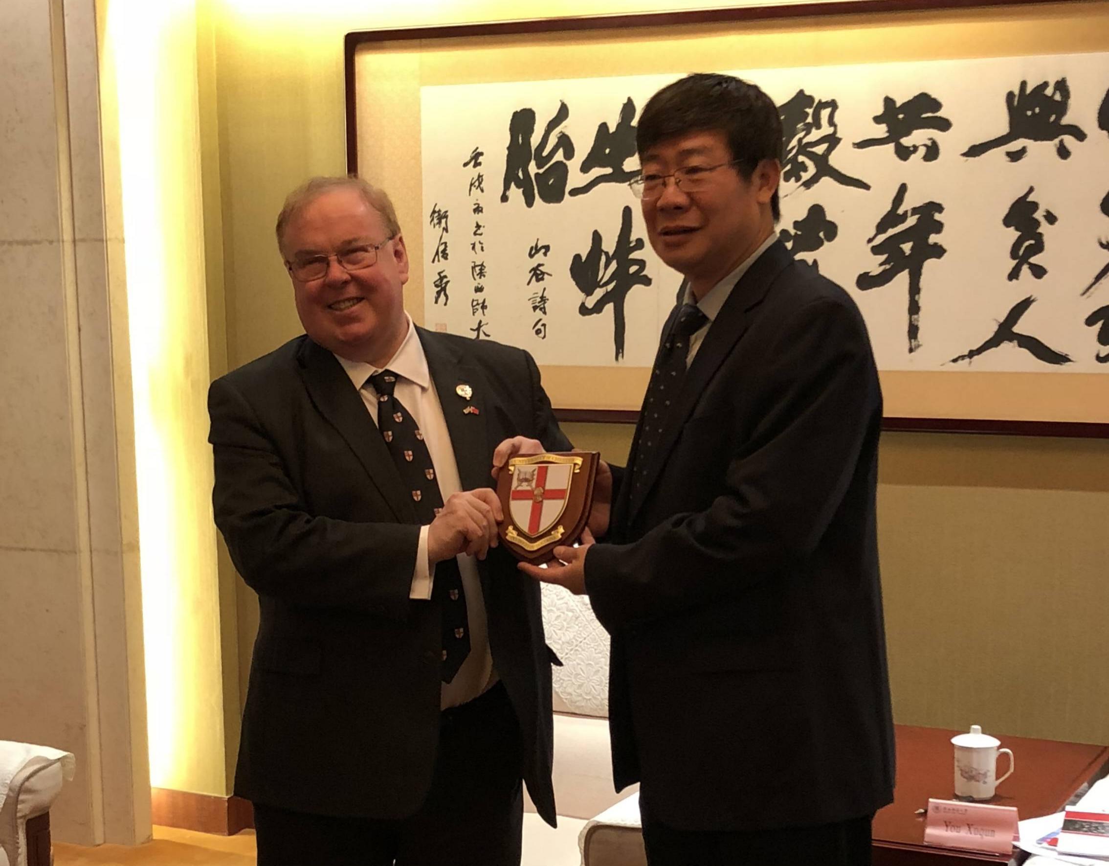 2019.04, YGL accompanied Professor Tim Wheeler, Vice-Chancellor of University of Chester, paid a visit to Shaanxi Normal University and exchanged presents with Professor YOU Xuqun, Vice President of SNNU.