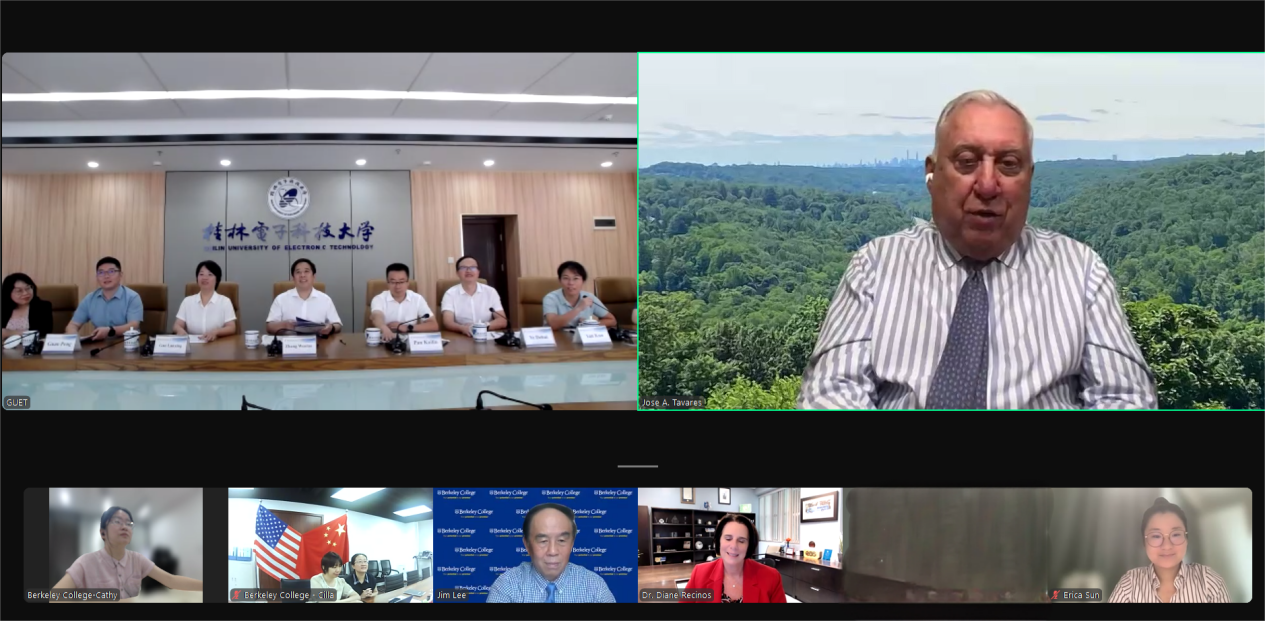 At 9am Beijing time on July 9, 2024, Guilin University of Electronic Technology and Berkeley College from the United States held a Zoom online conference to discuss international cooperation between the two universities and signed the MOU agreement on site. Presidents of both universities attended the meeting as the representatives. At the meeting, the host of the Chinese party first introduced the leaders and guests, and then the president of Berkeley, Diane Recinos, delivered a speech. The leaders from both sides respectively presented detailed information about the two universities through exquisite PPT presentation, including their history and advantages. The foreign side specifically introduced international cooperation experience, especially their successful cooperation with Sanya University. Afterwards, the discipline leader from the Chinese side carefully explained the talent cultivation, teaching and education, scientific research cooperation, and industry education cooperation in their respective field.