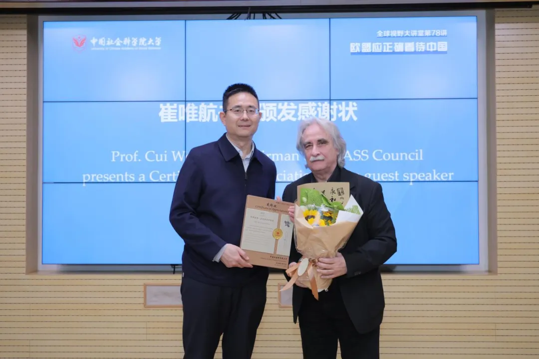 Following the lecture, Secretary Cui Weihang presented Professor Gouliamos with a Certificate of Appreciation for his insightful and engaging lecture to the UCASS faculty and students. As a long-standing friend of YGL, Professor Gouliamos also commended YGL's endeavors in fostering mutual learning between Chinese and European civilizations and promoting multi-level exchanges. In response, YGL expressed its commitment to continuing its close collaboration with Professor Gouliamos to enhance cultural exchange and cooperation between Chinese and European universities.