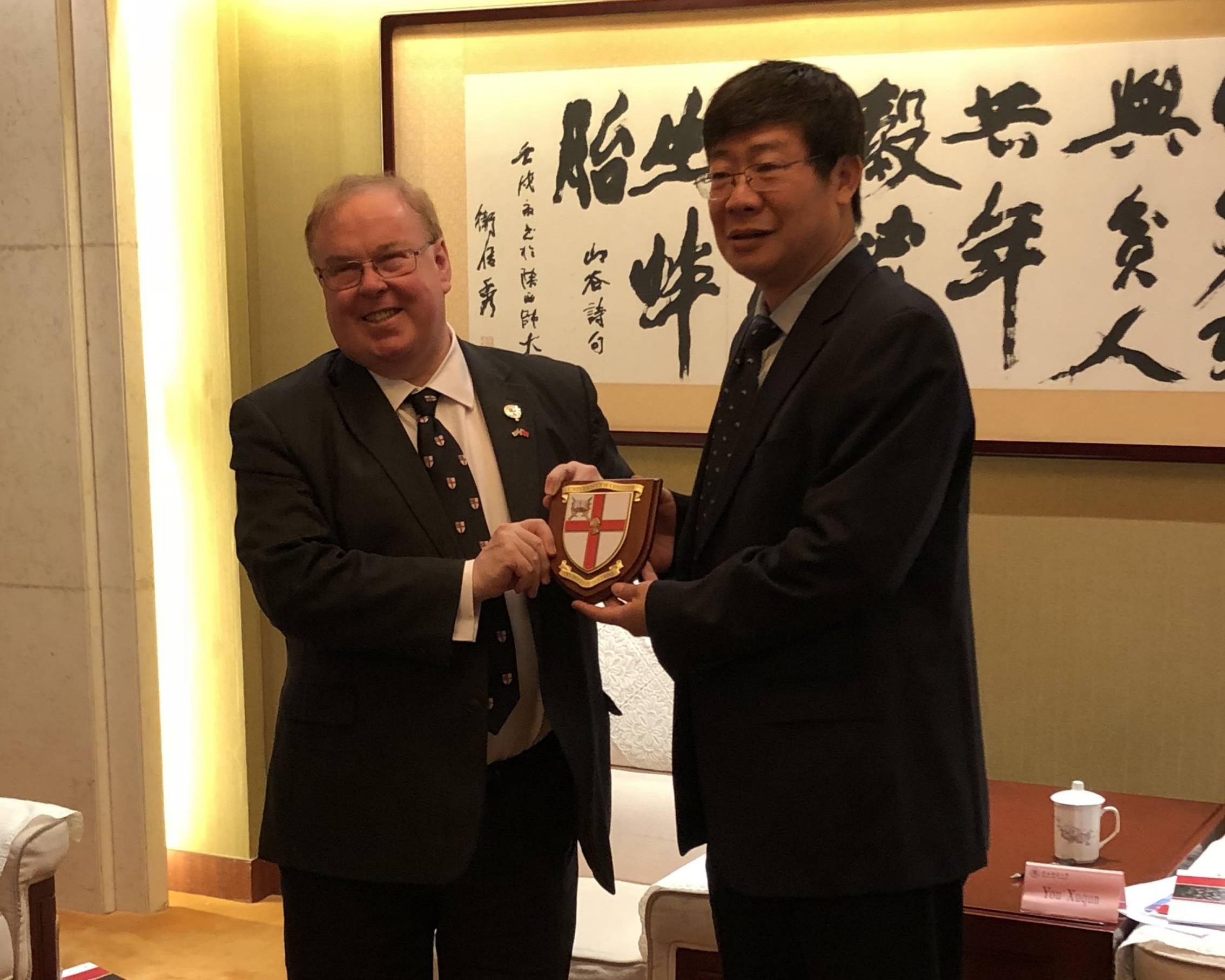 In Apr. 2019, YGL accompanied Professor Tim Wheeler, Vice-Chancellor of University of Chester, paid a visit to Shaanxi Normal University and exchanged presents with Professor YOU Xuqun, Vice President of SNNU.